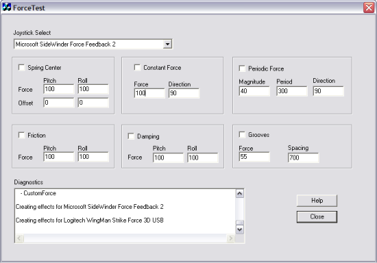 This is a small utility program you can download to test the force feedback capabilities of your joystick.  If FS Force doesn't seem to be working properly, you can use this utility to test your joystick, which can be helpful in determining if the problem is with FS Force, your system, or your joystick.